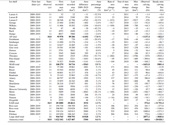 L’interpretazione di questa tabella consente agli scienziati di valutare le tendenze complessive nel comportamento delle piattaforme di ghiaccio, di identificare le regioni più vulnerabili ai cambiamenti climatici e di comprendere meglio il potenziale impatto sul livello del mare globale e sulla dinamica del sistema climatico terrestre.