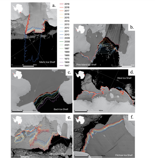 Le mappe sono sovrapposte a immagini satellitari MODIS del 2019, offrendo una visione contemporanea delle piattaforme di ghiaccio e del loro ambiente circostante. La legenda a colori rappresenta l’evoluzione temporale del fronte di calving, con ogni colore che corrisponde a un anno specifico in cui il fronte di calving è stato mappato. Questo tipo di analisi è cruciale per comprendere i processi dinamici delle piattaforme di ghiaccio e per valutare il loro potenziale impatto sul livello del mare globale, soprattutto in relazione ai cambiamenti climatici.