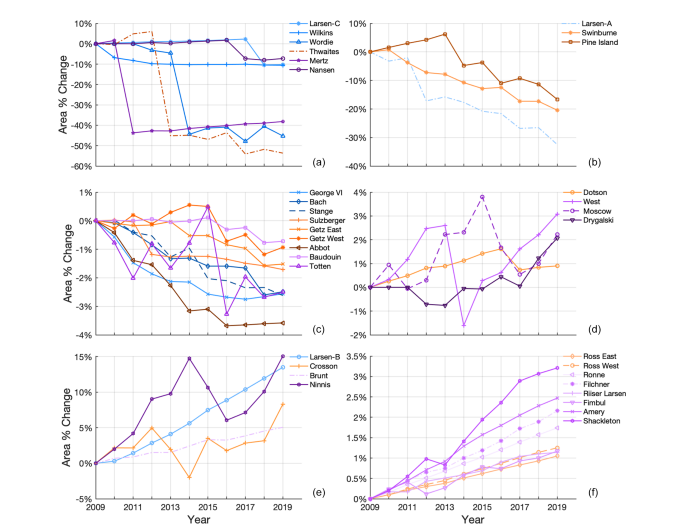 L’asse verticale (Y) di ciascun grafico indica la variazione percentuale dell’area rispetto all’anno di base (2009), mentre l’asse orizzontale (X) mostra la progressione annuale fino al 2019. Le linee tracciano l’andamento di ciascuna piattaforma di ghiaccio, permettendo di osservare le tendenze e le fluttuazioni nel corso del decennio.