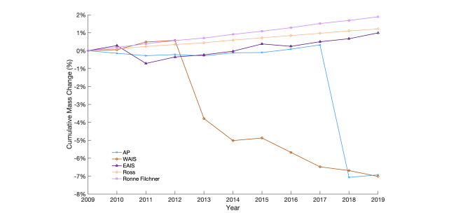 La Figura 4 mostra il cambiamento cumulativo della massa delle piattaforme di ghiaccio dal 2009 al 2019 per diverse regioni dell’Antartide e per due delle sue piattaforme di ghiaccio più grandi. I dati sono rappresentati come percentuale di cambiamento rispetto al valore iniziale misurato nel 2009. Ecco i dettagli delle diverse linee nel grafico: