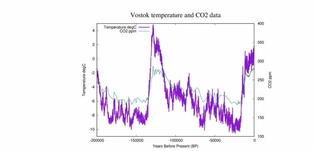 È però essenziale interpretare correttamente la variabile termica mostrata nel grafico. La scala della temperatura, centrata attorno a valori compresi fra circa −10 e +5 °C, non rappresenta la temperatura assoluta dell’aria a Vostok, ma una ricostruzione relativa o un’anomalia ricavata dal segnale isotopico. Per questo il testo della figura precisa che, per trasformarla in una stima della temperatura superficiale assoluta, occorrerebbe applicare un offset di circa −55 °C. In altre parole, ciò che conta qui non è il valore assoluto, ma l’ampiezza delle oscillazioni. Un altro punto importante è che la figura, pur intitolata “Vostok temperature and CO2 data”, copre un intervallo temporale superiore al record Vostok classico: in senso stretto, infatti, il record pubblicato da Petit et al. si estende a circa 420.000 anni, mentre l’estensione verso 740.000–800.000 anni appartiene al record EPICA Dome C, che concorda bene con Vostok nella parte sovrapposta. Quindi la figura andrebbe interpretata più correttamente come una rappresentazione della grande archivistica glaciale antartica Vostok-EPICA, piuttosto che del solo carotaggio Vostok.