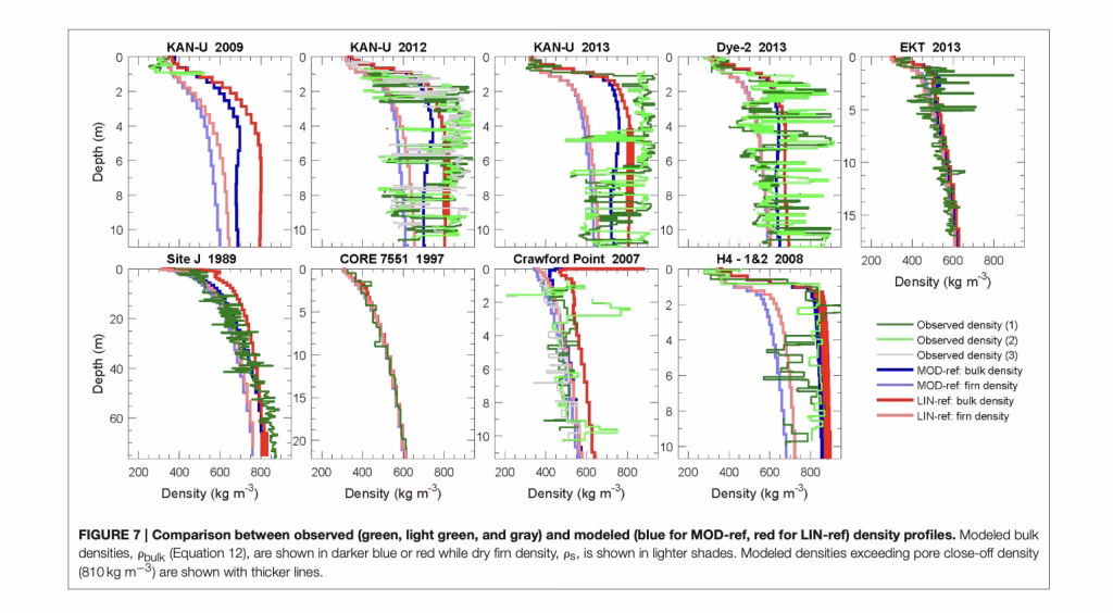 Nel complesso, la Figura 7 va letta come un test integrato della catena fisica “fusione → infiltrazione → ricongelamento → densificazione → perdita di permeabilità”: dove domina la densificazione asciutta, MOD-ref e LIN-ref convergono e seguono bene le osservazioni; dove entrano in gioco rifusione e stratigrafia a lenti, i profili osservati diventano fortemente non monotoni e la qualità del modello dipende soprattutto da come rappresenta il trasporto dell’acqua e la formazione di livelli a bassa permeabilità. È proprio in questa zona di transizione—non nell’interno completamente asciutto e nemmeno nelle aree già quasi impermeabili—che si gioca una parte decisiva dell’incertezza sulle future capacità di ritenzione del firn e quindi sul bilancio di massa della Groenlandia in un clima che continua a favorire stagioni di fusione più frequenti e intense.