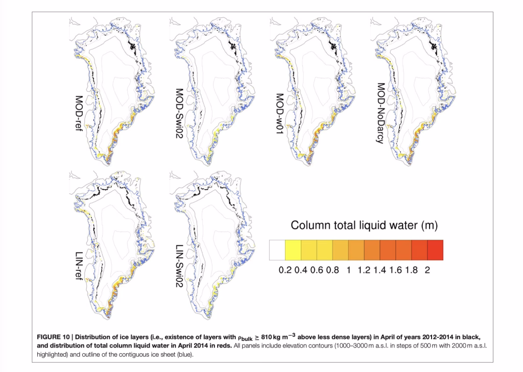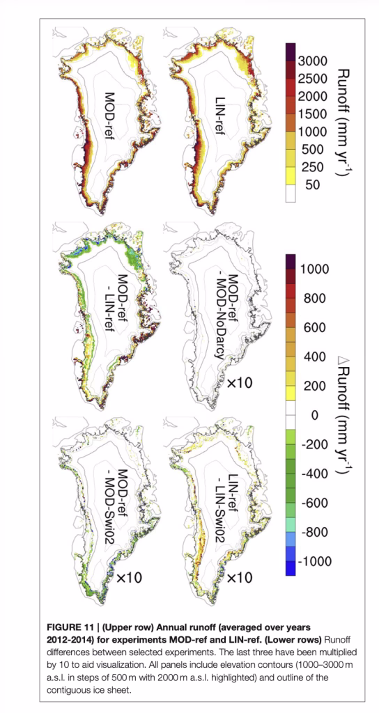In sintesi, la Figura 11 formalizza una gerarchia di controlli: (1) la scelta dell’albedo domina il runoff su scala Groenlandia perché determina la produzione totale di meltwater e la posizione della snowline; (2) la struttura del firn(aquiferi perenni vs strati a bassa permeabilità) modula localmente la conversione melt→runoff e può spostare la runoff line; (3) i dettagli del trasporto verticale (Darcy/NoDarcy) influenzano soprattutto la variabilità fine del campo d’acqua ma hanno impatto ridotto sul runoff medio pluriennale nel clima attuale simulato. Il punto che resta aperto—e che la stessa letteratura recente sottolinea—è che in un clima più caldo la componente (2) potrebbe “pesare” di più: se ice slabs e runoff area continuano a espandersi verso l’interno, l’effetto oggi piccolo nelle mappe differenza potrebbe diventare progressivamente più rilevante anche a scala di calotta.