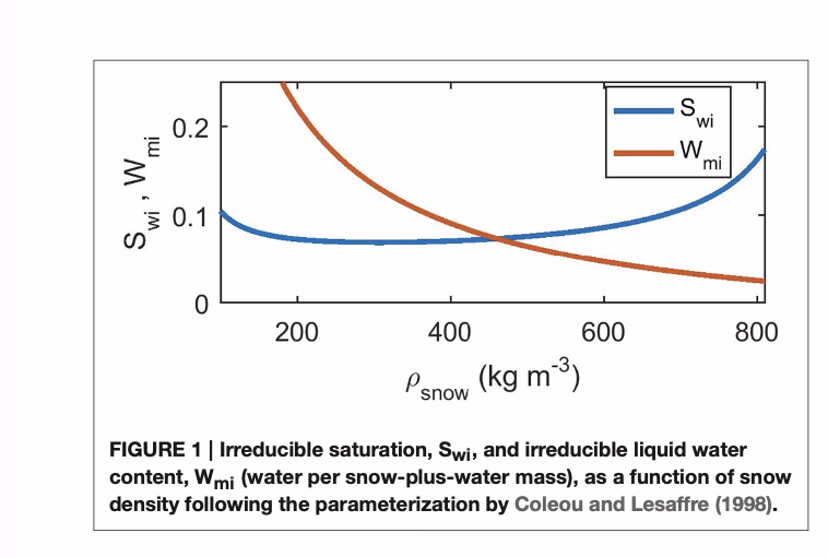 Il punto cruciale, che spiega perché in letteratura si trovino valori molto diversi, è che la saturazione irriducibile non è un “numero universale”: dipende dalla microstruttura della neve e quindi, in pratica, dalla densità e dalla porosità (oltre che da metamorfismo, forma dei grani, storia di bagnamento e ricongelamento). Esperimenti in laboratorio hanno evidenziato sia valori attorno a pochi centesimi, sia valori più elevati, a parità di densità nominale, proprio perché cambiano le caratteristiche del mezzo poroso e la curva di ritenzione. Per questo Coléou e Lesaffre hanno proposto un’impostazione in cui il contenuto irriducibile è funzione della porosità, mostrando che l’acqua intrappolata “di base” può essere descritta in modo sistematico a partire dalla struttura del manto nevoso; questa idea è poi diventata uno standard operativo in diversi modelli.