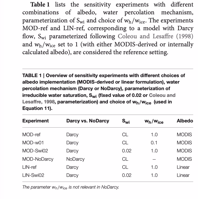 Riassumendo esplicitamente i “dati” della tabella in forma narrativa: MOD-ref = (Darcy, Swi = CL, wh/wice = 1.0, albedo MODIS)MOD-w01 = (Darcy, Swi = CL, wh/wice = 0.1, albedo MODIS)MOD-Swi02 = (Darcy, Swi = 0.02, wh/wice = 1.0, albedo MODIS)MOD-NoDarcy = (NoDarcy, Swi = CL, wh/wice non applicabile, albedo MODIS)LIN-ref = (Darcy, Swi = CL, wh/wice = 1.0, albedo Linear)LIN-Swi02 = (Darcy, Swi = 0.02, wh/wice = 1.0, albedo Linear). La logica complessiva è quella di un disegno “one-factor-at-a-time” attorno a due baseline energetiche (MODIS vs Linear), una strategia classica per attribuire causalmente differenze di runoff e temperatura nel firn a singoli processi (assorbimento radiativo, trasporto poroso, ritenzione capillare), che in Groenlandia sono noti essere determinanti per spiegare sia la variabilità interannuale del deflusso sia le transizioni strutturali del firn (per esempio l’emergere di strati impermeabili o acquiferi di firn) documentate osservazionalmente nell’ultimo ventennio (Harper et al., 2012; Forster et al., 2014; Koenig et al., 2014).