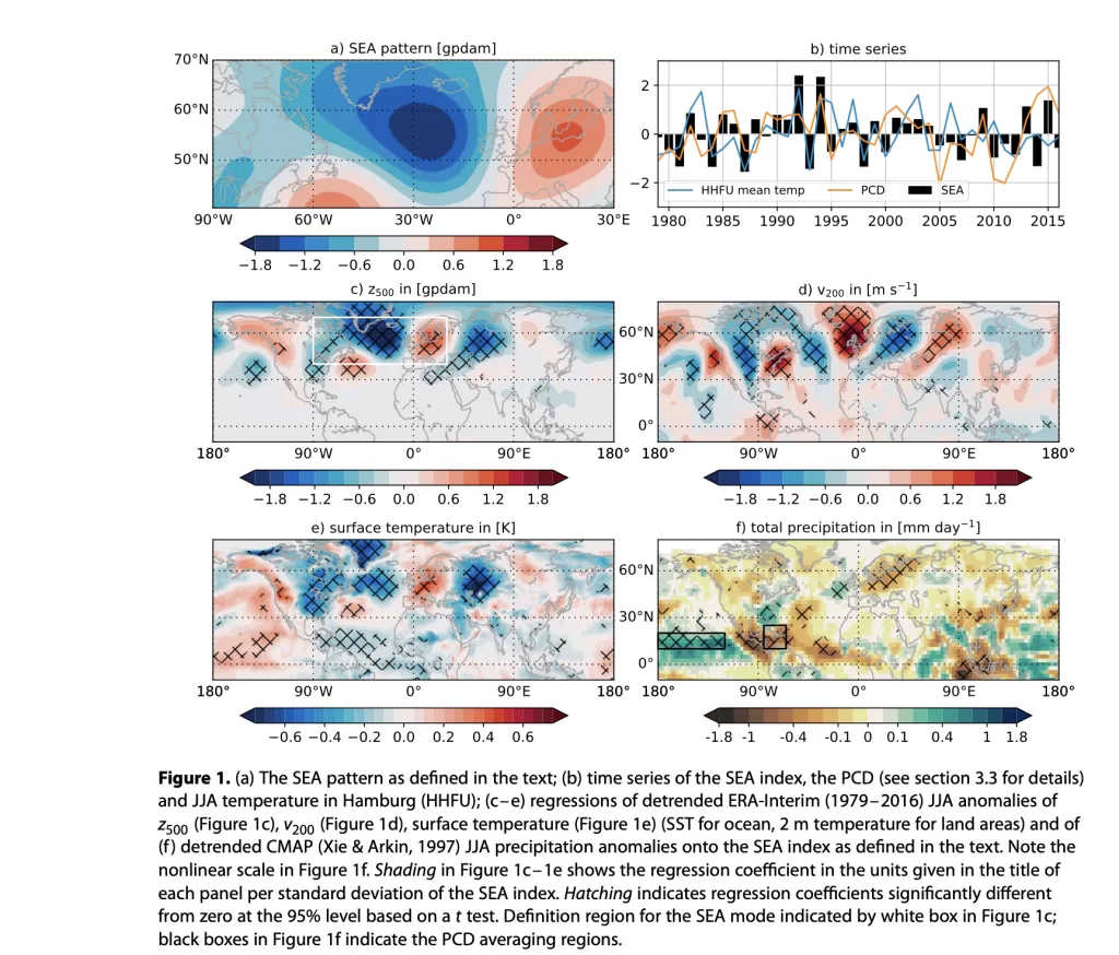 - (b) Serie Temporali dell’Indice SEA: Il pannello (b) presenta l’evoluzione temporale dell’indice SEA (barre nere), calcolato come la serie temporale del Componente Principale associato alla seconda EOF, coprendo il periodo 1980–2015. Questo indice quantifica l’ampiezza del pattern SEA nel tempo. Parallelamente, sono riportate la temperatura media a Amburgo (HHFU, linea blu), come indicatore locale di variabilità termica, e l’indice del Dipolo di Precipitazione (PCD, linea arancione), che riflette un pattern di precipitazioni opposte tra regioni tropicali. Le fluttuazioni interannuali dell’indice SEA evidenziano una variabilità significativa, con correlazioni evidenti con le anomalie termiche locali e i pattern di precipitazione, suggerendo un’influenza del SEA su scala regionale e oltre.