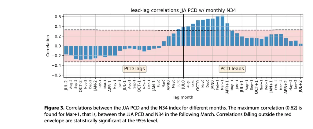 Analisi Dettagliata della Figura 3: Correlazioni Lead-Lag tra l’Indice Pacifico-Caraibico (PCD) e l’Indice N34: Implicazioni per le Dinamiche Climatiche Tropicali-Extratropicali