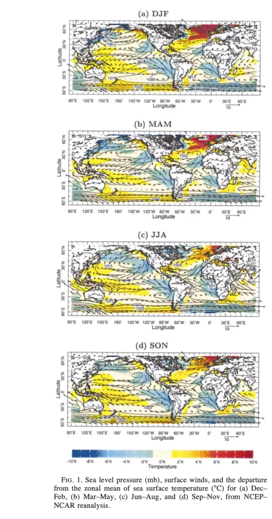 La figura in esame presenta una serie di quattro mappe globali che illustrano le variazioni stagionali della pressione a livello del mare (espressa in millibar, mb), dei venti superficiali e della deviazione della temperatura superficiale del mare (SST, Sea Surface Temperature) rispetto alla media zonale (in gradi Celsius). Queste mappe, elaborate a partire dai dati di rianalisi del National Centers for Environmental Prediction–National Center for Atmospheric Research (NCEP-NCAR), coprono quattro periodi stagionali: (a) dicembre-febbraio (DJF), corrispondente all’inverno boreale; (b) marzo-maggio (MAM), primavera boreale; (c) giugno-agosto (JJA), estate boreale; e (d) settembre-novembre (SON), autunno boreale. Le mappe si estendono su un intervallo di latitudine compreso tra 60°S e 60°N e un intervallo di longitudine che va da 90°E a 80°E, offrendo una visione completa delle dinamiche atmosferiche e oceaniche su scala globale.