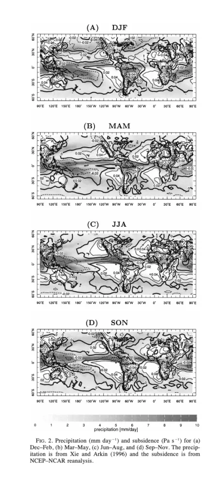La Figura 2 offre una rappresentazione dettagliata delle variazioni stagionali delle precipitazioni (misurate in millimetri al giorno, mm/giorno) e della subsidenza atmosferica (espressa in Pascal al secondo, Pa/s) a 700 mb, attraverso quattro mappe globali che coprono i periodi di (a) dicembre-febbraio (DJF), (b) marzo-maggio (MAM), (c) giugno-agosto (JJA) e (d) settembre-novembre (SON). I dati relativi alle precipitazioni sono estratti dal dataset di Xie e Arkin (1996), mentre quelli della subsidenza derivano dalle rianalisi del National Centers for Environmental Prediction–National Center for Atmospheric Research (NCEP-NCAR). Queste mappe si estendono su un intervallo di latitudine compreso tra 60°S e 60°N e un intervallo di longitudine che va da 90°E a 80°E, consentendo un’analisi completa delle dinamiche atmosferiche globali e delle loro variazioni stagionali.