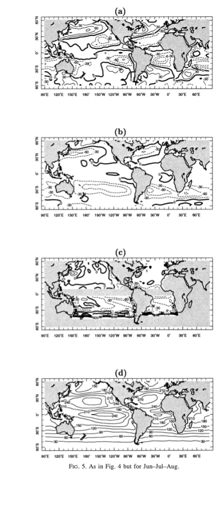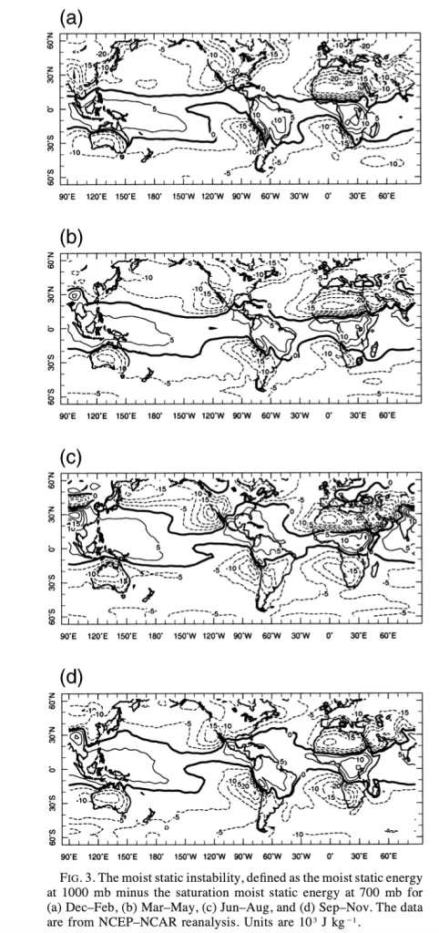 La Figura 3 offre una rappresentazione approfondita delle variazioni stagionali dell’instabilità statica umida, un parametro fondamentale per valutare la propensione dell’atmosfera alla convezione e alla formazione di nubi. Questo parametro è definito come la differenza tra l’energia statica umida a 1000 mb (livello vicino alla superficie) e l’energia statica umida di saturazione a 700 mb (media troposfera), ed è qui espresso in unità di 10³ J kg⁻¹. Le mappe coprono quattro periodi stagionali: (a) dicembre-febbraio (DJF), (b) marzo-maggio (MAM), (c) giugno-agosto (JJA), e (d) settembre-novembre (SON), e sono basate sui dati di rianalisi del National Centers for Environmental Prediction–National Center for Atmospheric Research (NCEP-NCAR). Ogni mappa si estende su un intervallo di latitudine compreso tra 60°S e 60°N e un intervallo di longitudine che va da 90°E a 80°E, consentendo un’analisi globale delle dinamiche atmosferiche associate alla stabilità e alla convezione.