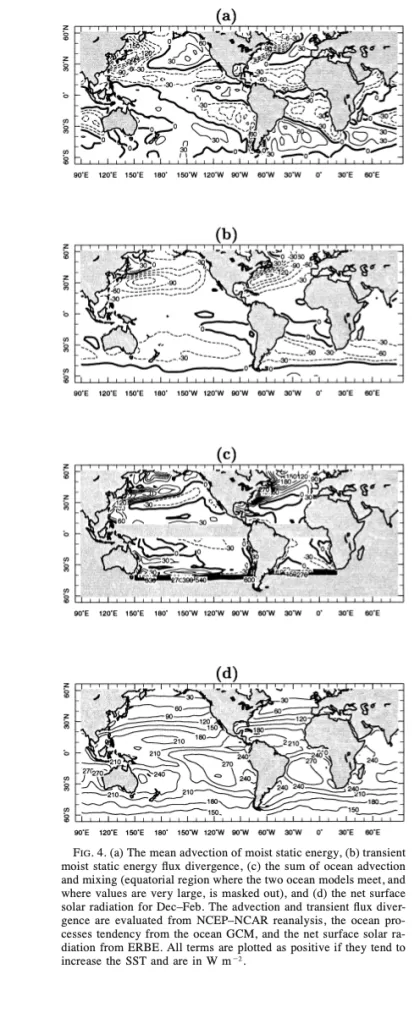 Entrambi i modelli oceanici sono accoppiati al modello dello strato misto atmosferico advettivo (AML) di Seager et al. (1995). Il modello AML calcola la temperatura e l’umidità dell’aria, insieme ai flussi superficiali di calore latente, sensibile e radiazione a onde lunghe, utilizzando la SST modellata e le velocità e direzioni del vento osservate. Questo approccio consente di rappresentare accuratamente l’accoppiamento termodinamico tra atmosfera e oceano, un elemento essenziale per comprendere come la SST venga determinata dalle interazioni aria-mare. I modelli oceanici sono forzati da stress del vento, velocità e direzioni del vento osservate, derivati da daSilva et al. (1994) per il Pacifico settentrionale e dalle rianalisi NCEP-NCAR per le altre regioni. Inoltre, la radiazione solare superficiale necessaria per i modelli è ottenuta dai dataset ERBE o ISCCP, con una correzione per rimuovere l’offset medio tra i due, come indicato da Seager e Blumenthal (1994).