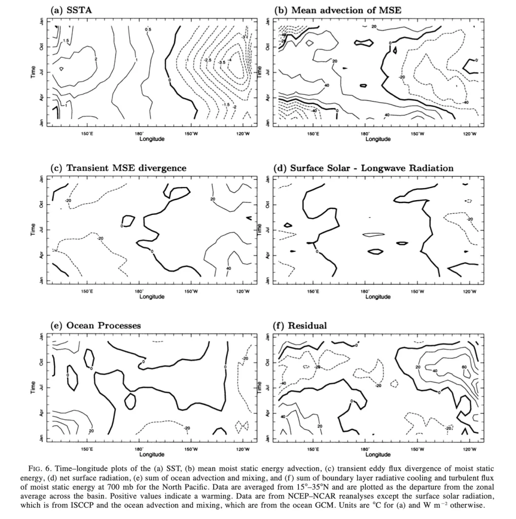 La Figura 6 offre una visione dettagliata delle dinamiche che governano l’asimmetria zonale della SST nel Pacifico settentrionale, evidenziando l’interazione complessa tra processi atmosferici e oceanici. Il trasporto medio di energia statica umida emerge come il principale motore dell’asimmetria, rafforzandola dalla primavera all’estate attraverso un forte contrasto zonale. I processi oceanici, in particolare l’approfondimento dello strato misto e il trasporto di calore da parte della Corrente di Kuroshio, giocano un ruolo cruciale nel mantenere l’asimmetria durante l’inverno, contrastando il raffreddamento atmosferico. Le variazioni transitorie e il termine residuo (raffreddamento radiativo e flusso turbolento) modulano ulteriormente l’asimmetria, con effetti che variano stagionalmente. La radiazione superficiale netta ha un ruolo secondario, con un impatto limitato alle coste orientali, dove il feedback tra nubi e radiazione amplifica il raffreddamento locale. Questi diagrammi tempo-longitudine forniscono una base solida per comprendere il ciclo stagionale della SST e il ruolo dell’interfaccia aria-mare nel bilancio energetico delle regioni subtropicali, con implicazioni per la modellizzazione climatica e la previsione delle variazioni climatiche.