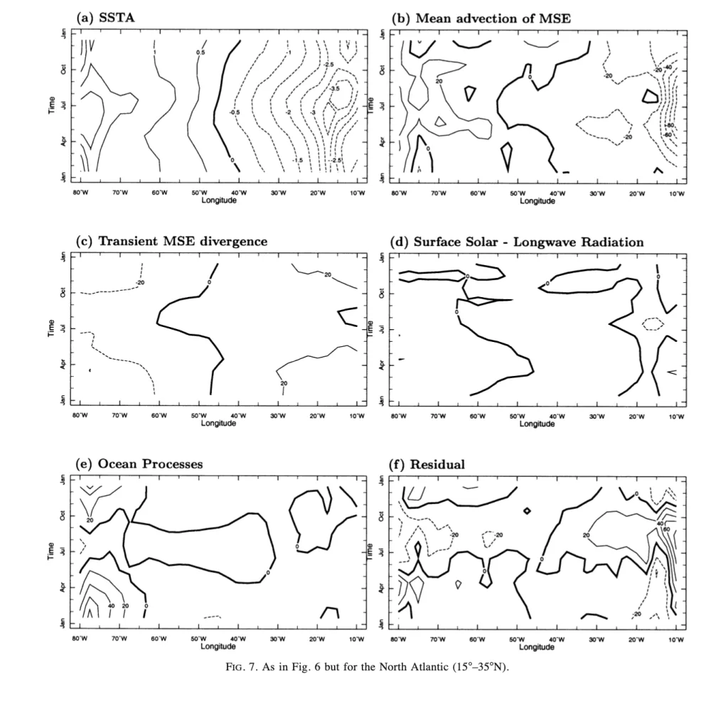 La Figura 7 presenta una serie di diagrammi tempo-longitudine che descrivono l’evoluzione stagionale della temperatura superficiale del mare (SST, Sea Surface Temperature) e dei processi che la modulano nell’Atlantico settentrionale, con un focus sulla fascia latitudinale compresa tra 15° e 35° N, che copre le regioni subtropicali. I dati sono rappresentati come deviazioni dalla media zonale del bacino, un approccio che consente di evidenziare l’asimmetria zonale tra le regioni orientali e occidentali. Valori positivi indicano una tendenza al riscaldamento, mentre valori negativi denotano un raffreddamento. Le unità sono in gradi Celsius (°C) per la SST e in W/m² per gli altri parametri. I dati derivano principalmente dalle rianalisi NCEP–NCAR, con la radiazione solare superficiale ottenuta dal dataset ISCCP (International Satellite Cloud Climatology Project) e i contributi di advezione e miscelazione oceanica calcolati tramite un modello di circolazione generale oceanica (GCM). La figura si compone di sei pannelli, ciascuno dei quali analizza un processo specifico, permettendo un confronto diretto con i risultati della Figura 6, che si concentrava sul Pacifico settentrionale. Questa analisi offre un quadro dettagliato delle dinamiche atmosferiche e oceaniche che determinano l’asimmetria della SST nell’Atlantico settentrionale e delle sue differenze rispetto al Pacifico.