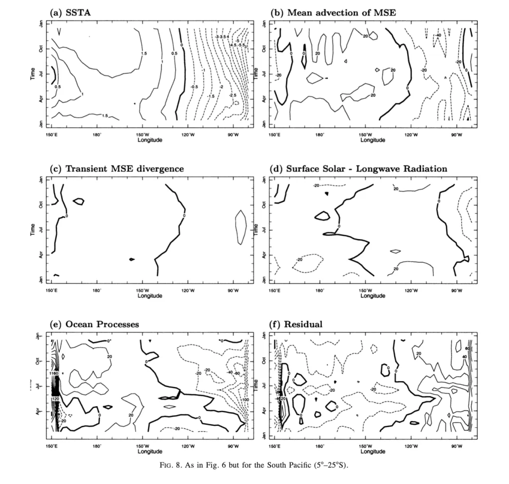 La Figura 8 presenta una serie di diagrammi tempo-longitudine che descrivono l’evoluzione stagionale della temperatura superficiale del mare (SST, Sea Surface Temperature) e dei processi che la modulano nel Pacifico meridionale, con un focus sulla fascia latitudinale compresa tra 25° e 5° S. Questa regione è stata selezionata per riflettere la posizione più equatoriale del massimo di asimmetria della SST nell’emisfero australe, un aspetto distintivo rispetto all’emisfero settentrionale. I dati sono rappresentati come deviazioni dalla media zonale del bacino, un metodo che evidenzia l’asimmetria zonale tra le regioni orientali e occidentali. Valori positivi indicano una tendenza al riscaldamento, mentre valori negativi denotano un raffreddamento. Le unità sono in gradi Celsius (°C) per la SST e in W/m² per gli altri parametri. I dati derivano principalmente dalle rianalisi NCEP–NCAR, con la radiazione solare superficiale ottenuta dal dataset ISCCP (International Satellite Cloud Climatology Project) e i contributi di advezione e miscelazione oceanica calcolati tramite un modello di circolazione generale oceanica (GCM). La figura si compone di sei pannelli, ciascuno dedicato a un processo specifico, permettendo un confronto con le Figure 6 e 7, che analizzavano i bacini settentrionali. Questa analisi offre un quadro dettagliato delle dinamiche atmosferiche e oceaniche nel Pacifico meridionale, evidenziando le peculiarità dell’emisfero australe.