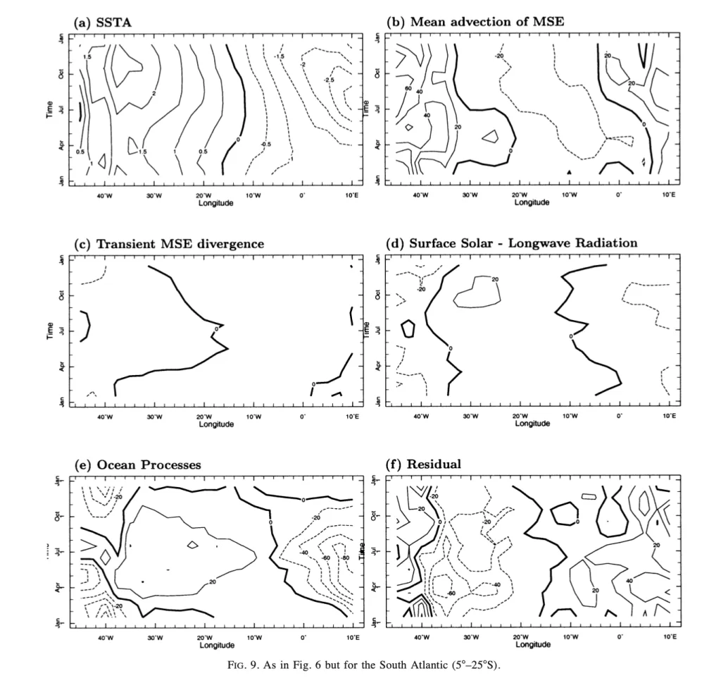 La Figura 9 presenta una serie di diagrammi tempo-longitudine che descrivono l’evoluzione stagionale della temperatura superficiale del mare (SST, Sea Surface Temperature) e dei processi che la modulano nell’Atlantico meridionale, con un focus sulla fascia latitudinale compresa tra 5° e 25° S. Questa regione è stata selezionata per riflettere la posizione più equatoriale del massimo di asimmetria della SST nell’emisfero australe, un aspetto distintivo rispetto all’emisfero settentrionale, e per consentire un confronto diretto con il Pacifico meridionale (Figura 8). I dati sono rappresentati come deviazioni dalla media zonale del bacino, un approccio che evidenzia l’asimmetria zonale tra le regioni orientali e occidentali. Valori positivi indicano una tendenza al riscaldamento, mentre valori negativi denotano un raffreddamento. Le unità sono in gradi Celsius (°C) per la SST e in W/m² per gli altri parametri. I dati derivano principalmente dalle rianalisi NCEP–NCAR, con la radiazione solare superficiale ottenuta dal dataset ISCCP (International Satellite Cloud Climatology Project) e i contributi di advezione e miscelazione oceanica calcolati tramite un modello di circolazione generale oceanica (GCM). La figura si compone di sei pannelli, ciascuno dedicato a un processo specifico, offrendo una visione dettagliata delle dinamiche atmosferiche e oceaniche nell’Atlantico meridionale e permettendo un confronto con i risultati delle Figure 6, 7 e 8.
