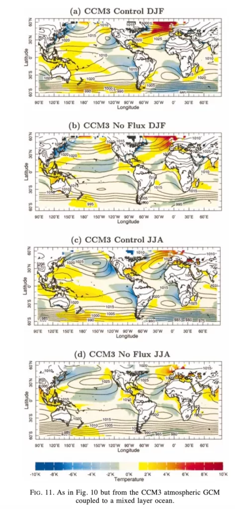 Confronto con la Figura 10 e sintesi dei risultati: Rispetto alla Figura 10, che utilizzava il modello GISS, la Figura 11 con il modello CCM3 mostra risultati qualitativamente simili, con gli anticicloni subtropicali che mantengono la loro struttura fondamentale anche in assenza del q-flux, confermando che la loro genesi è principalmente guidata dal riscaldamento atmosferico imposto. Tuttavia, il modello CCM3 tende a produrre anomalie delle SST leggermente meno intense in assenza di q-flux, suggerendo una diversa sensibilità del modello alle forzanti oceaniche rispetto al GISS. Ad esempio, le anomalie calde nel Pacifico orientale durante JJA sono più pronunciate nel modello GISS (fino a +8°C con q-flux) rispetto al CCM3 (circa +6°C senza q-flux). Le differenze stagionali tra DJF e JJA riflettono i cambiamenti nella posizione delle forzanti atmosferiche, come lo spostamento latitudinale dell’ITCZ e le variazioni nel riscaldamento monsonico, che influenzano sia le SST sia la configurazione delle alte pressioni subtropicali. In sintesi, la Figura 11 sottolinea l’importanza delle interazioni aria-mare locali nel modulare la variabilità climatica, evidenziando al contempo come diversi modelli climatici possano rispondere in modo leggermente diverso alle stesse forzanti, un aspetto cruciale per comprendere l’incertezza nelle simulazioni climatiche globali.