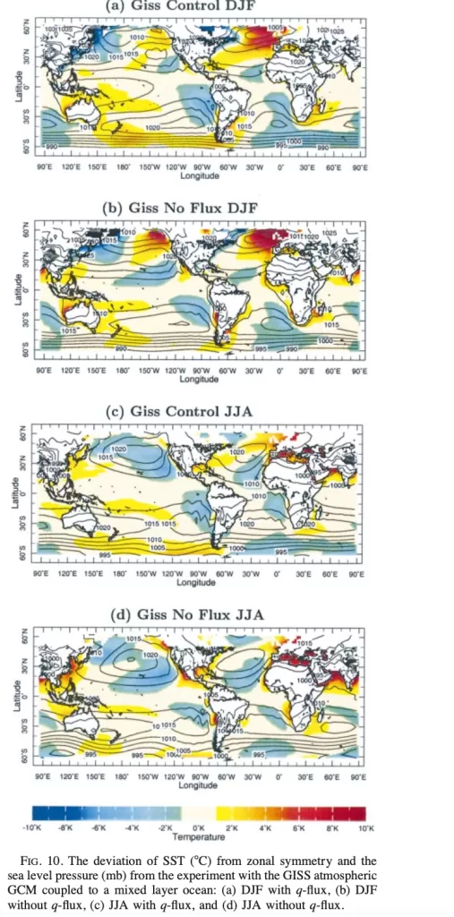 Il secondo pannello, denominato (b) GISS No Flux DJF (DJF senza q-flux), ripropone la stagione invernale boreale, ma in un esperimento in cui il q-flux è rimosso, eliminando quindi l’effetto del trasporto di calore oceanico. Le deviazioni delle SST mostrano un pattern qualitativamente simile a quello del pannello (a), con anomalie calde nel Pacifico occidentale e nell’Atlantico settentrionale, e anomalie fredde nell’Atlantico meridionale e nel Pacifico orientale. Tuttavia, si notano differenze significative: le anomalie calde nel Pacifico occidentale appaiono meno intense, con valori massimi intorno a +4°C, mentre le aree fredde nell’Atlantico meridionale risultano più estese, con deviazioni che raggiungono i -10°C in alcune zone. La pressione a livello del mare continua a mostrare la presenza degli anticicloni subtropicali, con valori comparabili a quelli del caso con q-flux (1010-1020 mb), ma con leggere variazioni nella loro posizione e intensità, suggerendo che il trasporto di calore oceanico ha un ruolo modulatore, sebbene non dominante, sulla distribuzione delle SST e sulla dinamica degli anticicloni.