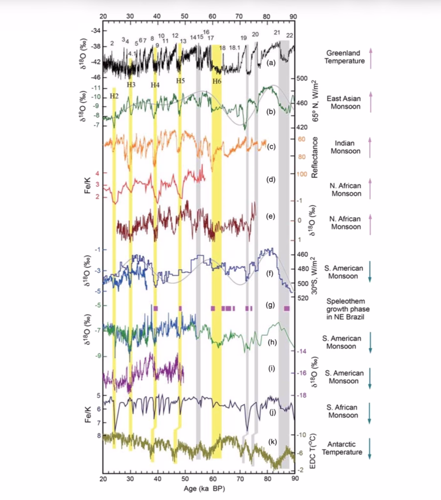 La parte forse più istruttiva della figura è però l’evidenza di un comportamento in antifase tra i monsoni dei due emisferi. I record sudamericani, inclusi quelli di Botuverá, del Perù settentrionale, di Pacupahuain e soprattutto i periodi umidi del Brasile nord-orientale, mostrano che molte fasi fredde groenlandesi e molti eventi di Heinrich coincidono con condizioni più umide nell’America tropicale meridionale. Il lavoro classico di Wang e Auler su NE Brasile evidenziò proprio che i periodi umidi tropicali di quella regione risultano sincroni con episodi di debolezza del monsone asiatico e con anomalie fredde dell’emisfero nord. In parallelo, la sintesi di Cheng e colleghi sul “global paleomonsoon” mise in risalto, su un ampio intervallo di scale temporali, una relazione interemisferica in antifase tra il sistema monsonico asiatico e quello sudamericano. Questa configurazione è esattamente ciò che ci si aspetterebbe se la banda convettiva tropicale e la ITCZ si spostassero verso l’emisfero relativamente più caldo: nelle fasi di raffreddamento del Nord Atlantico, la convergence zone si trasferisce verso sud, il ramo ascendente dell’overturning tropicale favorisce il Sud America e, simultaneamente, si indeboliscono molti dei massimi pluviometrici boreali. La figura è quindi particolarmente preziosa perché consente di leggere i proxy non come archivi separati, ma come parti di un’unica seesaw idrologica interemisferica. Anche il record del monsone dell’Africa australe e la presenza del segnale antartico nella parte inferiore della figura contribuiscono a rafforzare questa idea di un sistema climatico tropicale e subtropicale collegato da grandi aggiustamenti meridionali della pioggia e della circolazione.