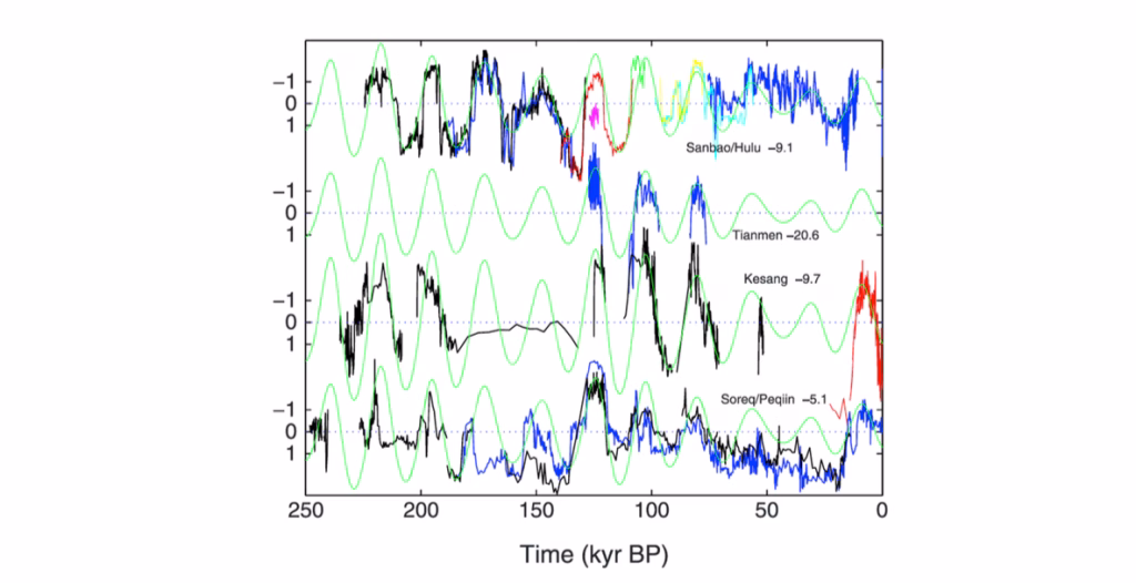 Ciò non significa, però, che il δ¹⁸O speleotemico possa essere utilizzato senza cautele come indice univoco di precipitazione locale. La stessa letteratura più recente insiste sul fatto che, soprattutto nell’Asia orientale, il proxy isotopico rappresenti un segnale di circolazione integrata più che un semplice “rain gauge” regionale. La review del 2019 evidenzia che il disaccordo con alcuni archivi indipendenti di precipitazione deriva proprio da questa natura composita del segnale, mentre il commento di Gebregiorgis e colleghi ha ribadito che interpretare automaticamente il δ¹⁸O come intensità del monsone estivo, senza specificare la scala temporale e il significato fisico del proxy, può essere fuorviante. Tuttavia, questa apparente difficoltà interpretativa non indebolisce la Figura 5; al contrario, ne chiarisce il valore. Il grafico funziona così bene proprio perché si colloca alla scala temporale in cui il δ¹⁸O delle stalagmiti conserva la massima coerenza con la dinamica monsonica a grande scala e con l’insolazione estiva boreale, mentre le ambiguità aumentano soprattutto alle scale più brevi. La figura, quindi, non va letta come una prova semplicistica che “più insolazione uguale più pioggia in ogni grotta”, ma come una dimostrazione che l’intero sistema isotopico-monsoonico asiatico è profondamente modulato dal ritmo orbitale della precessione.