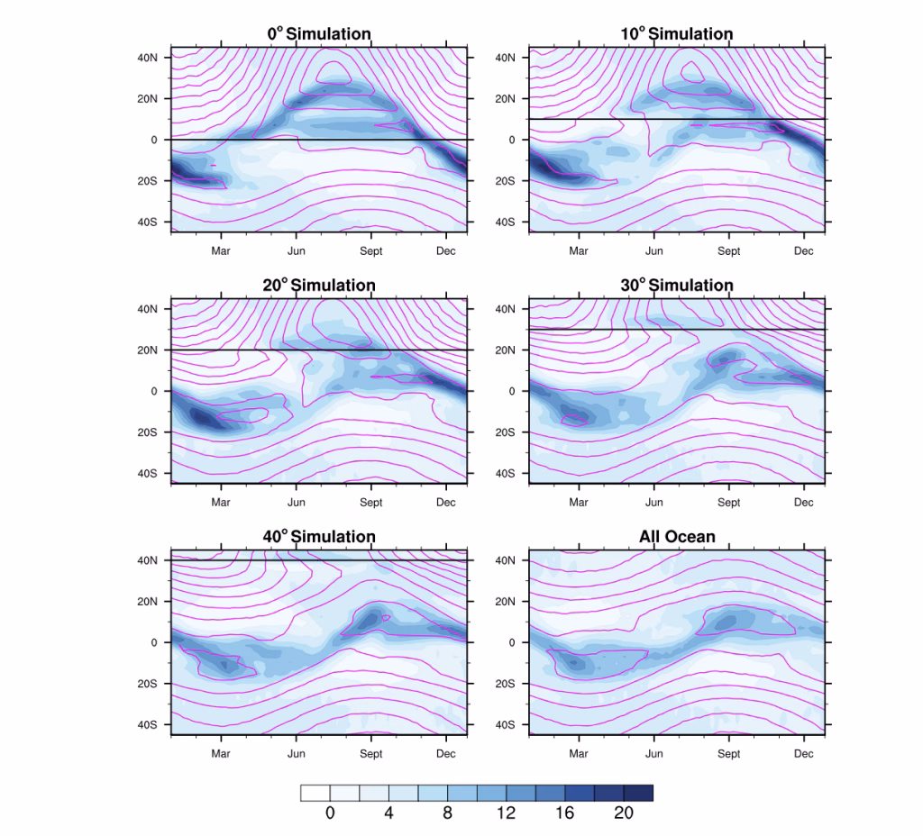Un altro contributo fondamentale di questa letteratura riguarda il ruolo dell’inerzia termica superficiale. Negli aquaplanet con slab ocean poco profondo, la superficie reagisce rapidamente al forcing stagionale e la convergenza tropicale può migrare in modo ampio e quasi monsonico; al contrario, aumentando la capacità termica superficiale, la risposta diventa più smorzata, più simmetrica e maggiormente confinata in prossimità dell’equatore. Questo risultato ha implicazioni teoriche notevoli, poiché suggerisce che l’estensione meridiana e la rapidità della migrazione della pioggia tropicale non dipendano solo dalla geometria del forcing solare, ma anche dal tempo di risposta del sistema superficie-atmosfera. In termini climatici, ciò aiuta a interpretare perché le regioni continentali e oceaniche, o le aree con diverso accoppiamento oceano-atmosfera, possano mostrare regimi stagionali profondamente differenti. Inoltre, tali esperimenti mostrano che la presenza di un monsone intenso richiede non solo un forcing stagionale favorevole, ma anche condizioni tali da permettere alla superficie e alla colonna atmosferica di rispondere con sufficiente ampiezza e rapidità. La dinamica monsonica viene così ricondotta a una combinazione di forcing astronomico, proprietà termiche della superficie e risposta interna della circolazione tropicale.
