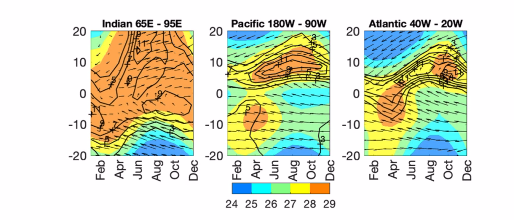 Accanto alla variabilità intrastagionale, sarà essenziale studiare più a fondo le connessioni tra monsoni, ITCZ e variabilità interemisferica e interbacino. La letteratura degli ultimi anni ha mostrato che la latitudine della convergenza tropicale e l’intensità dei monsoni non dipendono soltanto da forcing locali o emisferici, ma anche dalla struttura dei gradienti zonali di SST, dalla circolazione di Walker, dallo stato medio ENSO-like del Pacifico, dall’Atlantico tropicale e subtropicale e dal modo in cui l’oceano redistribuisce il calore tra i bacini. Studi di Xie, Chiang e Bitz, Schneider, Green e Marshall, Kang e collaboratori hanno messo in evidenza come l’interazione tra oceano e atmosfera possa spostare o deformare la convergenza tropicale in modi che sfuggono a una lettura puramente zonal-mean. Il futuro della ricerca richiederà dunque un’integrazione più stretta tra dinamica dei monsoni, teoria della ITCZ e climatologia dei bacini oceanici, in modo da comprendere quando la risposta della precipitazione sia dominata da un bilancio energetico interemisferico e quando invece da gradienti regionali o da teleconnessioni tropicali.