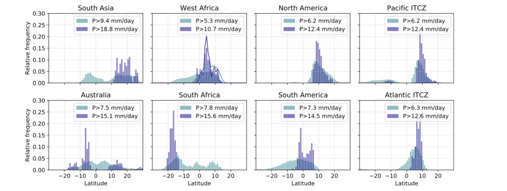 L’aspetto forse più importante della figura è che essa rende visibile la transizione da una climatologia dominata da una fascia di convergenza relativamente equatoriale a una climatologia caratterizzata da una marcata migrazione estiva della pioggia. Tale transizione ha profonde implicazioni teoriche. La visione classica del monsone, risalente a Halley e consolidata in molta letteratura descrittiva del XIX e XX secolo, enfatizzava il contrasto termico tra continenti e oceani come causa prima dell’inversione stagionale dei venti e della pioggia. Sebbene questa interpretazione mantenga una validità descrittiva per molti sistemi regionali, gli esperimenti di Bordoni e Schneider mostrano che il nucleo fisico del monsone può emergere anche in un sistema senza terra emersa, purché la superficie abbia una bassa inerzia termica. Ciò ha contribuito a una profonda revisione concettuale, secondo cui i monsoni sono meglio compresi come manifestazioni stagionali e regionalizzate della circolazione meridiana tropicale, piuttosto che come semplici risposte locali a un contrasto costa-continente. In questa linea si collocano anche lavori come quelli di Bordoni e Schneider (2010), che collegano il onset monsonico ai regimi della circolazione atmosferica e al grado di conservazione del momento angolare, e quelli di Shaw (2014) e Geen et al. (2018), che hanno ulteriormente sottolineato la continuità dinamica tra ITCZ, monsoni e circolazione di Hadley.