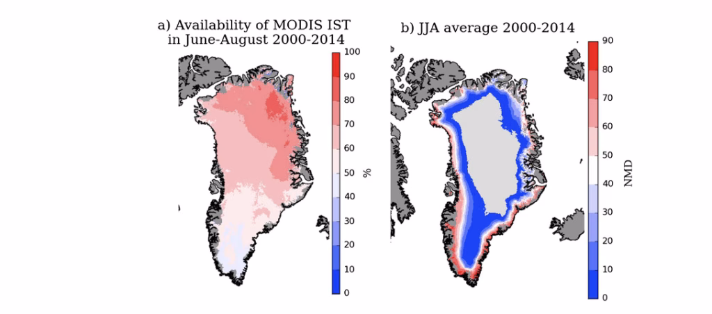 La Figura 1 serve, di fatto, a “mettere in sicurezza” l’intera analisi: prima mostra quanto il dataset MODIS di temperatura superficiale del ghiaccio (IST) sia effettivamente disponibile durante l’estate groenlandese, poi fa vedere quale struttura spaziale assume, in media, la fusione estiva quando la si diagnostica come numero di giorni di fusione (NMD). Nel pannello (a) la scala è una percentuale: indica per ogni pixel della calotta quante giornate di giugno–agosto, mediamente tra 2000 e 2014, presentano una stima valida di IST. Questa informazione è cruciale perché MODIS lavora nel canale infrarosso termico: la misura è molto informativa vicino al punto di fusione, ma è intrinsecamente vulnerabile alla copertura nuvolosa (e, più in generale, a condizioni atmosferiche che impediscono una “vista” chiara della superficie). Il disegno che emerge è tipico della Groenlandia estiva: un’ampia parte della calotta mostra disponibilità elevata, mentre alcune aree – soprattutto verso il sud e lungo settori costieri più esposti a ingressi umidi atlantici – evidenziano disponibilità più bassa, coerente con una maggiore frequenza di nubi e sistemi perturbati. In altre parole, la mappa non sta dicendo “qui la temperatura è più bassa”, ma “qui il satellite riesce meno spesso a misurare la temperatura della superficie”, e questo è un passaggio metodologico fondamentale perché, dove l’atmosfera è spesso nuvolosa, i giorni mancanti possono introdurre una tendenza a sottostimare (o quantomeno rendere più incerta) la frequenza della fusione se non si gestiscono bene i vuoti osservativi. È anche il motivo per cui gli autori insistono sulla bontà del prodotto proprio vicino a 0 °C: le validazioni precedenti (Hall et al., 2008; Hall et al., 2012, 2013; Shuman et al., 2014) mostrano che l’eventuale bias freddo del satellite diventa davvero problematico alle temperature molto basse, mentre nel “range decisionale” della fusione la coerenza con misure in situ è molto migliore, rendendo l’IST un proxy robusto per contare i giorni in cui la superficie entra (o sfiora criticamente) la condizione di melt.