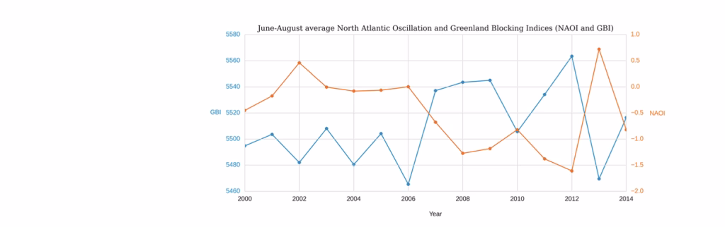 Infine, la figura aiuta a capire un punto metodologico spesso sottovalutato: NAO e blocking sono “parenti stretti”, ma non sono sinonimi. Ci sono anni in cui l’anticorrelazione è evidente (GBI alto ↔ NAOI negativo) e anni in cui la relazione è più sfumata, segnalando che altri pattern euro-atlantici (come East Atlantic pattern o Scandinavian pattern) e la posizione longitudinale delle anomalie possono modulare l’efficacia del blocco nel produrre avvezione calda/umida o nel cambiare il regime nuvoloso sopra la calotta (Lim, 2015). In altre parole, la Figura 2 non è solo un “contorno” descrittivo: è una chiave interpretativa che colloca le estati 2000–2014 lungo un asse dinamico (NAO/GBI) ben documentato in letteratura e che, per la Groenlandia, si traduce direttamente in differenze sostanziali nei giorni di fusione, nell’estensione del melt e nella quantità di acqua prodotta, soprattutto quando la circolazione entra in regimi di blocking persistente come nel 2012.