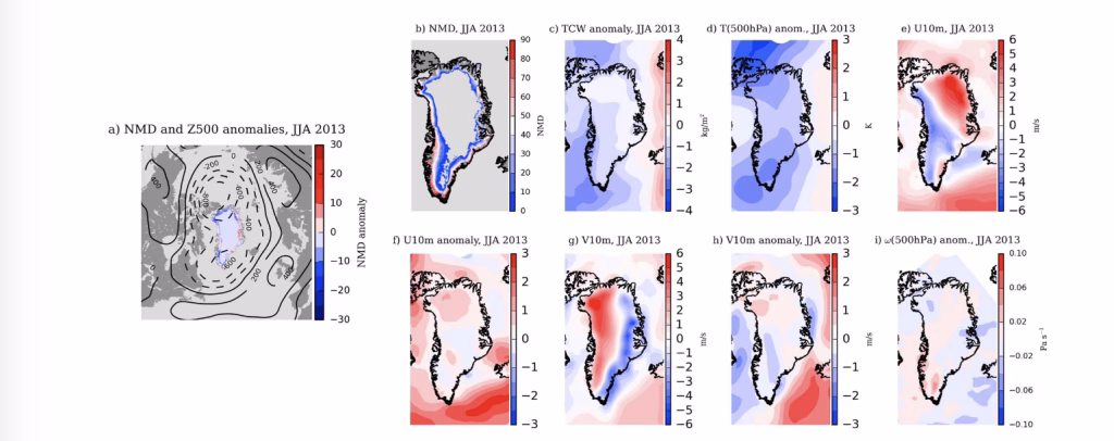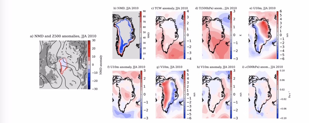 La Figura 7 riassume, per giugno–agosto 2010, come la fusione (qui descritta dal numero di giorni di fusione, NMD) sia stata il prodotto di un assetto atmosferico favorevole soprattutto lungo i margini della calotta, più che di un singolo forcing capace di “spingere” in modo sistematico la fusione verso l’interno. Tutte le anomalie atmosferiche mostrano scostamenti calcolati rispetto alla media JJA 2000–2014 e derivano da ERA-Interim, una rianalisi ampiamente usata per collegare circolazione e processi di superficie in Groenlandia.