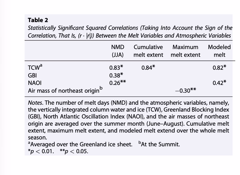 Gli indici di circolazione entrano, ma con un ruolo più “condizionale” e spazialmente eterogeneo. Il GBI compare in tabella solo per NMD, con 0,38*: segnala che estati con maggiore blocking groenlandese tendono ad avere più giorni di fusione, coerentemente con l’idea che i ridge a 500 hPa e la persistenza anticiclonica favoriscano condizioni favorevoli al melt (stagnazione, subsidenza, advezione calda sul fianco occidentale, ecc.). Tuttavia, il fatto che il GBI non risulti significativo per l’estensione cumulativa (nella tabella non compare) suggerisce che il blocking, da solo, non garantisce l’espansione progressiva della fusione su tutta la stagione: serve che la configurazione dinamica si accompagni a un adeguato apporto termo-igrometrico e a feedback superficiali (albedo/firn) che trasformano “potenziale sinottico” in fusione effettiva. Questo quadro è molto coerente con studi che hanno collegato l’aumento recente della fusione groenlandese alla maggiore frequenza di ridge in media troposfera e a pattern di circolazione favorevoli al melt.