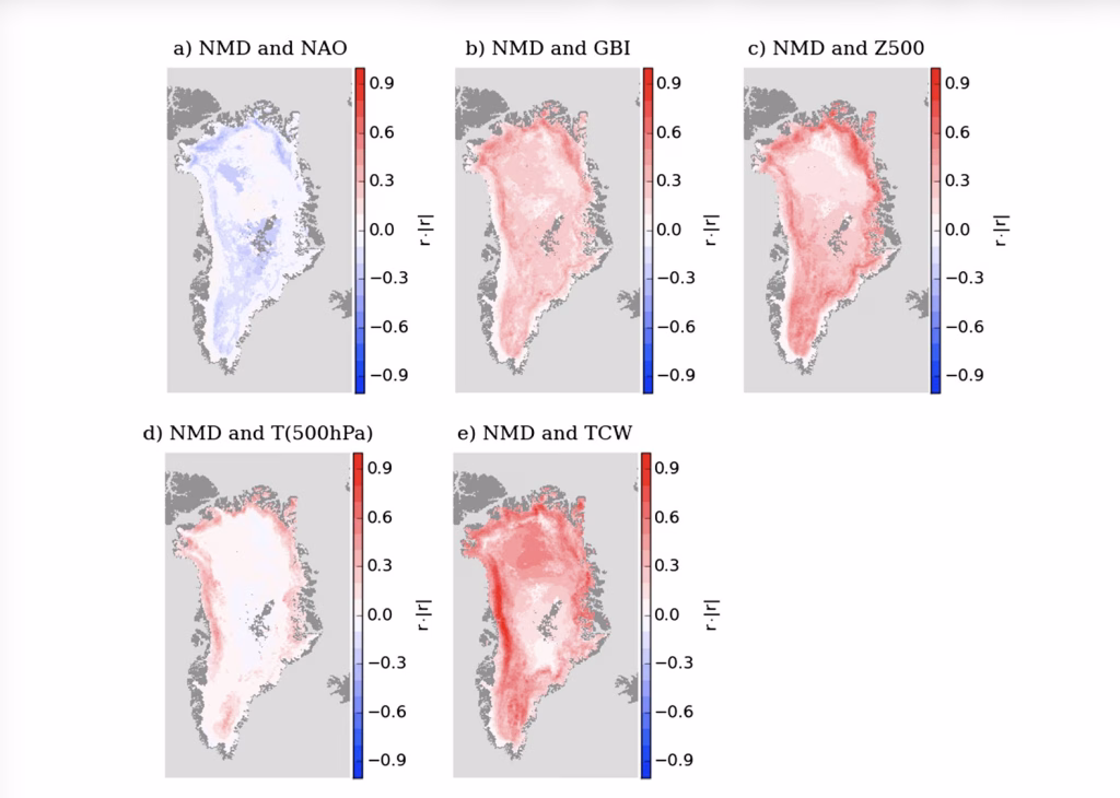 Un dettaglio regionale che emerge come peculiare è l’elevata correlazione locale tra Z500 e NMD nella Groenlandia nord-orientale (valori di r·|r| > ~0,60), suggerendo che in quell’area le variazioni del campo di pressione/geopotenziale su larga scala siano più determinanti per i giorni di fusione rispetto ad altre porzioni della calotta. Questo risultato, presentato come non ampiamente riportato in precedenza, è coerente con l’idea che nel settore settentrionale/NE piccoli spostamenti di dorsali e traiettorie d’aria possano cambiare in modo marcato sia l’avvezione in quota sia le condizioni di nuvolosità e radiazione, in un ambiente dove la frequenza di fusione è normalmente più bassa e quindi più sensibile a “finestre” favorevoli. La stessa letteratura recente sul blocking groenlandese sottolinea che non tutti i blocchi sono equivalenti: posizione e geometria della dorsale determinano impatti diversi su energia superficiale e trasporto meridionale.